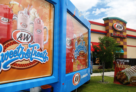 A&W will utilize a special mobile advertising truck for their “Sweets & Treats” campaign, which features 10 scrolling billboards showcasing the new A&W Cherry Lemonade slushee and BananaBerry Dream smoothee. In a 3D mobile showroom, the truck will feature a replica of a 1950’s A&W diner, serving samples of the sweet treats to event crowds.